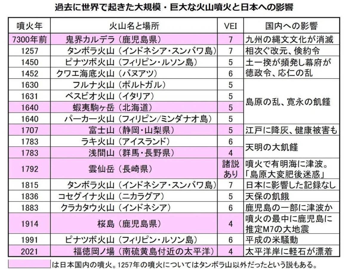 江戸時代にも、日本は何度か海外での火山噴火が原因とみられる飢饉に見舞われた。1631年にはイタリアのベスビオ火山、40年にはフィリピン・ミンダナオ島のパーカー火山が噴火し、日本では寛永の飢饉が発生している。ともにVEIは5で巨大噴火ではないが、他にもVEI4クラスの噴火が重なったことで大量の硫酸エアロゾルが放出されたとみられる。