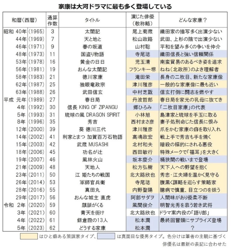 家康が単独で大河ドラマの主役になるのは昭和58年(1983年)の『徳川家康』以来40年ぶりだが、62作目となる大河ドラマで、家康は実に27作に登場している。
