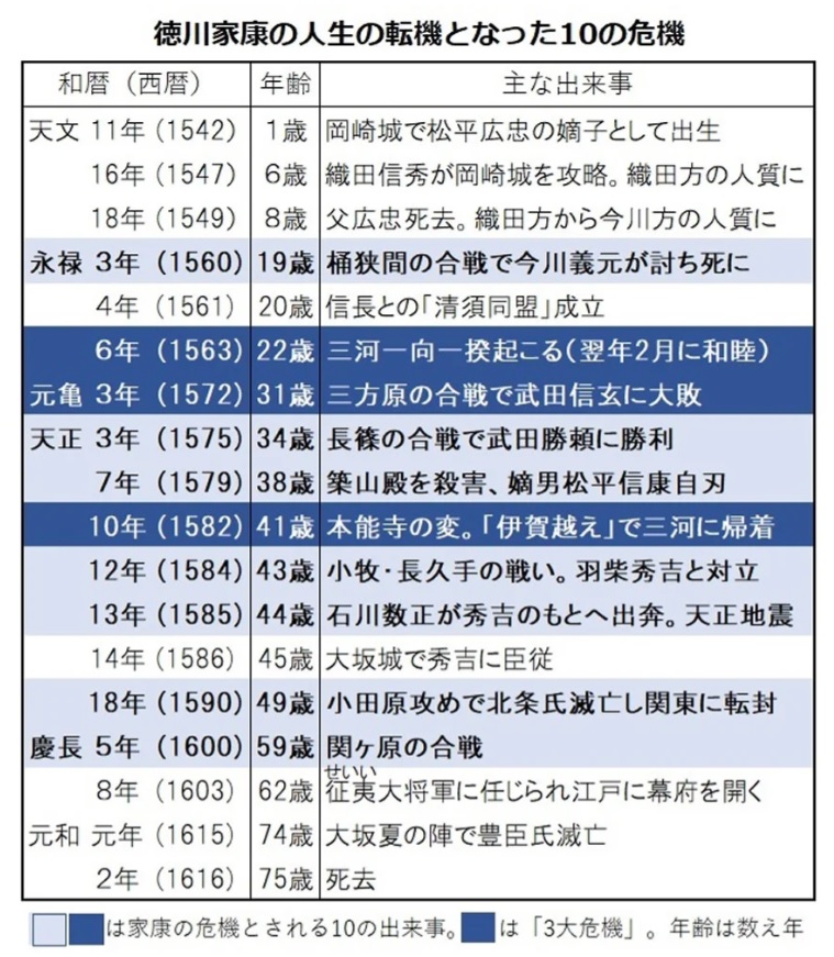 家康は生涯で10の危機に直面したとされ、桶狭間の合戦での義元討ち死にはその最初の危機だった。ドラマが描くように家康は大高城から駿河に帰るか、岡崎に向かうかの選択を迫られ、岡崎にある松平氏の菩提ぼだい 寺、大樹寺に入る。寺伝によると、家康はそこを敵に囲まれ、いったんは先祖の墓前で自害することを考えたという。