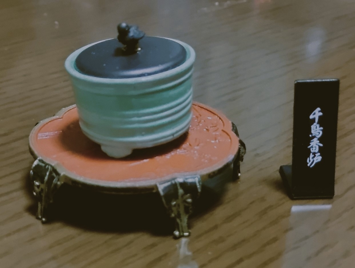トイズキャビンのカプセルトイ「戦国の茶器」の大人買いを続けていたら、本棚の一角が変の直前の本能寺みたいなことになってきた。蘭奢待、三足ノ蛙、平蜘蛛の釜、黄金の茶窯などがそろった。それぞれ深い由来がある。コンプリート記念に、その中から天下の大名物「千鳥の香炉」(青磁香炉 銘 千鳥)を紹介したい。