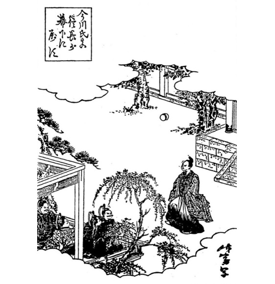 信長の前で蹴鞠を披露する氏真(『絵本太閤記』国立国会図書館蔵)