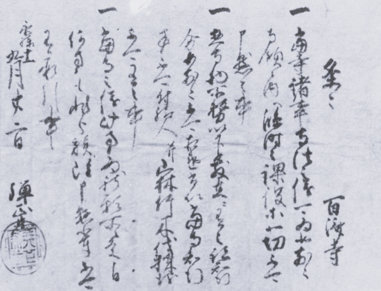 一、 百済寺は信長の祈願所とする。他の者が祈願所にすると申し出ても受け入れてはならない